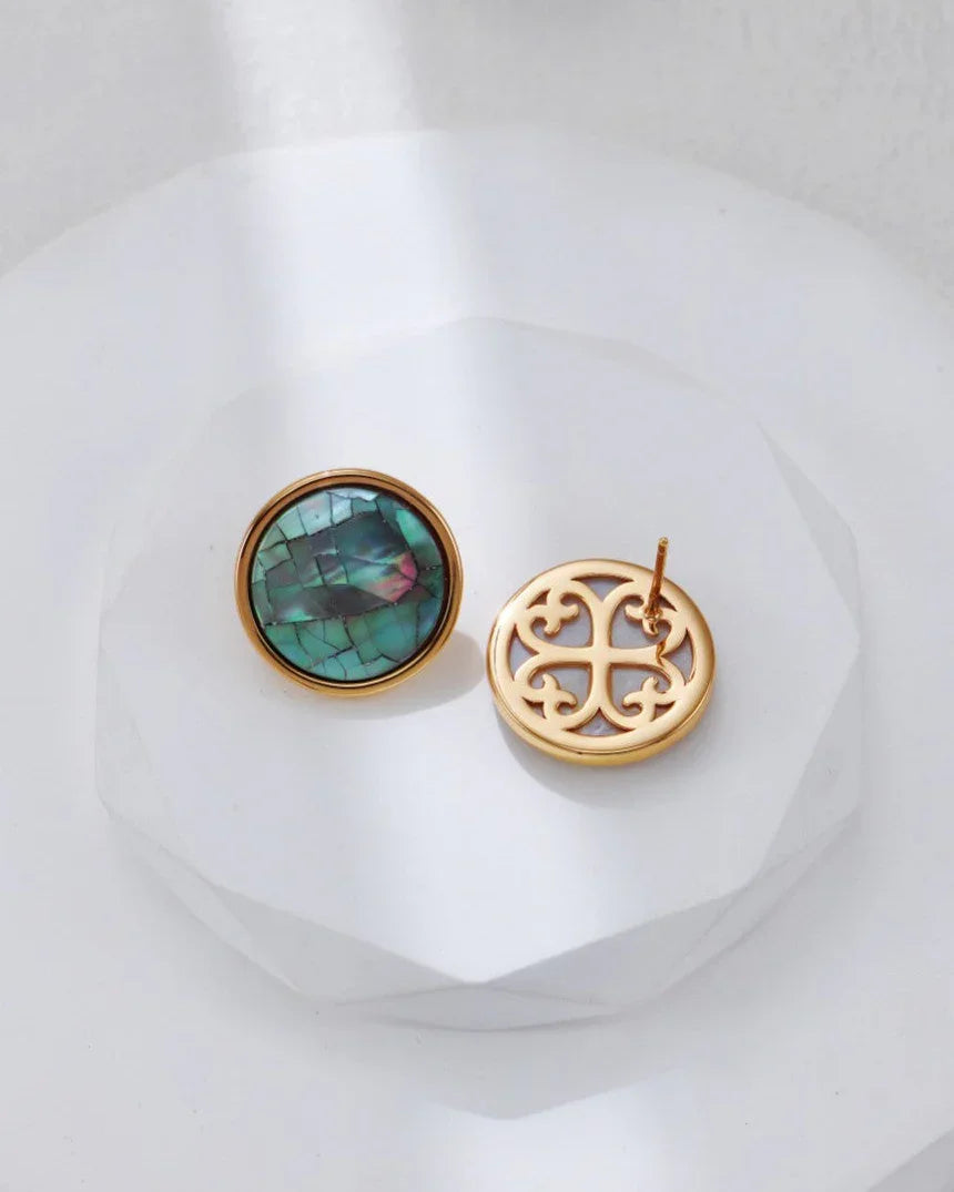 Aurora Shell Crackle-øredobbene har iriserende skjelloverflater med naturlige sprekker, som reflekterer en regnbuelignende glød i lyset. Hvert skjell avslører unike teksturer og fargerik glimmer, noe som gjør hvert smykke unikt. Den vintage gullbelagte rammen komplementerer det livlige skallet, og skaper en harmonisk balanse mellom eleganse og havinspirert sjarm. Disse særegne og raffinerte øredobbene bringer både kunstnerisk utførelse og naturens skjønnhet inn i et tidløst tilbehør.