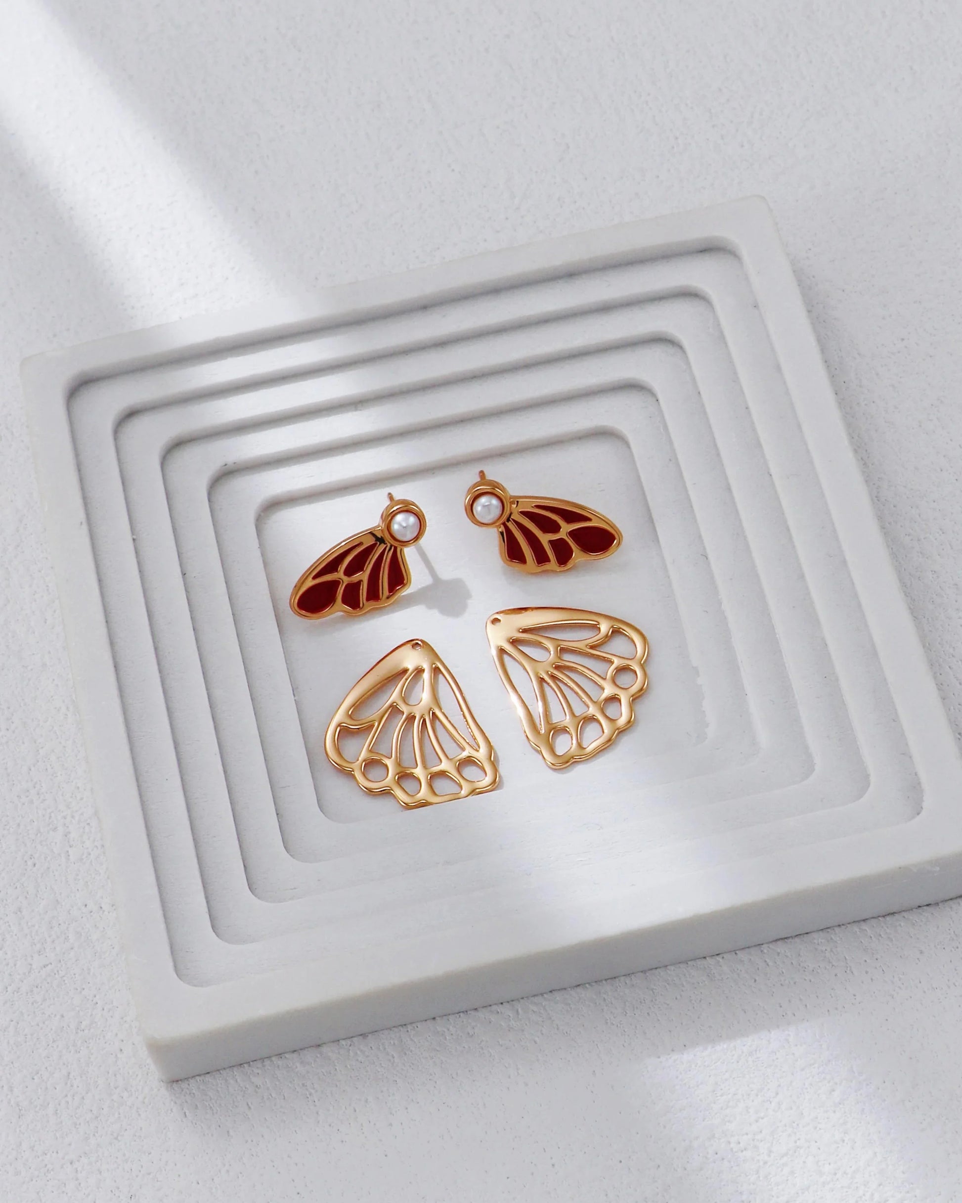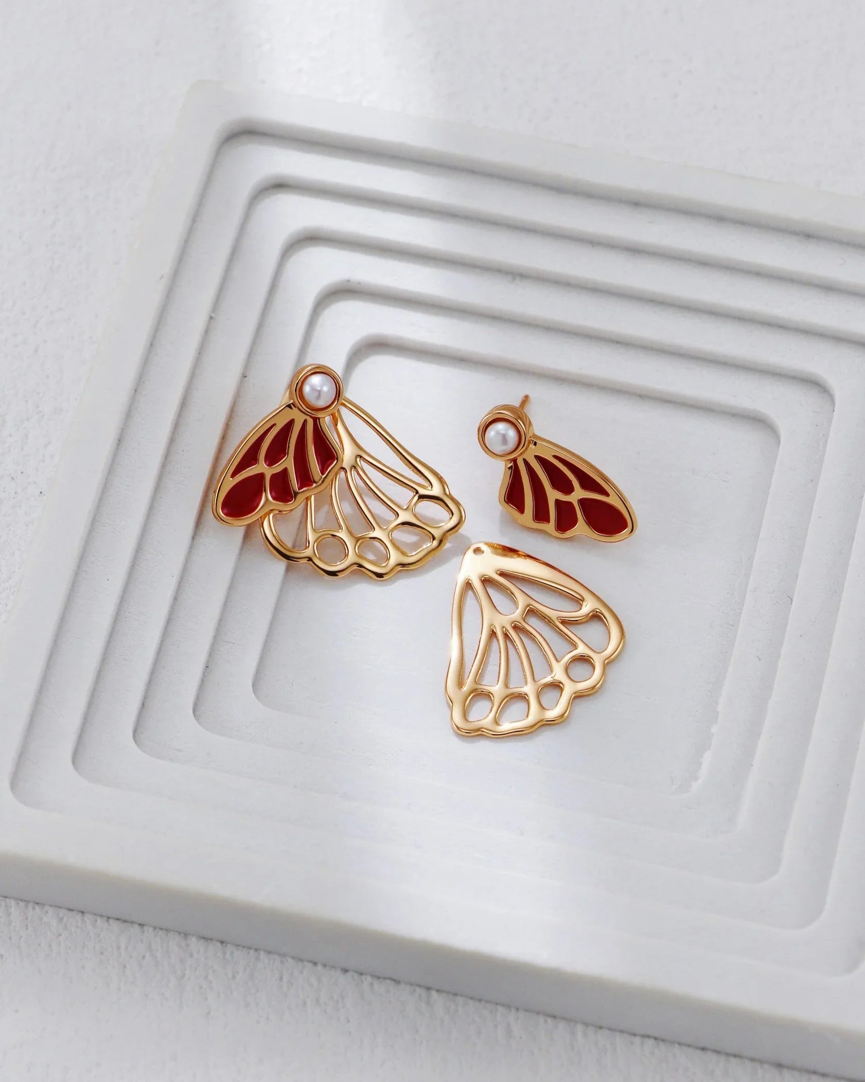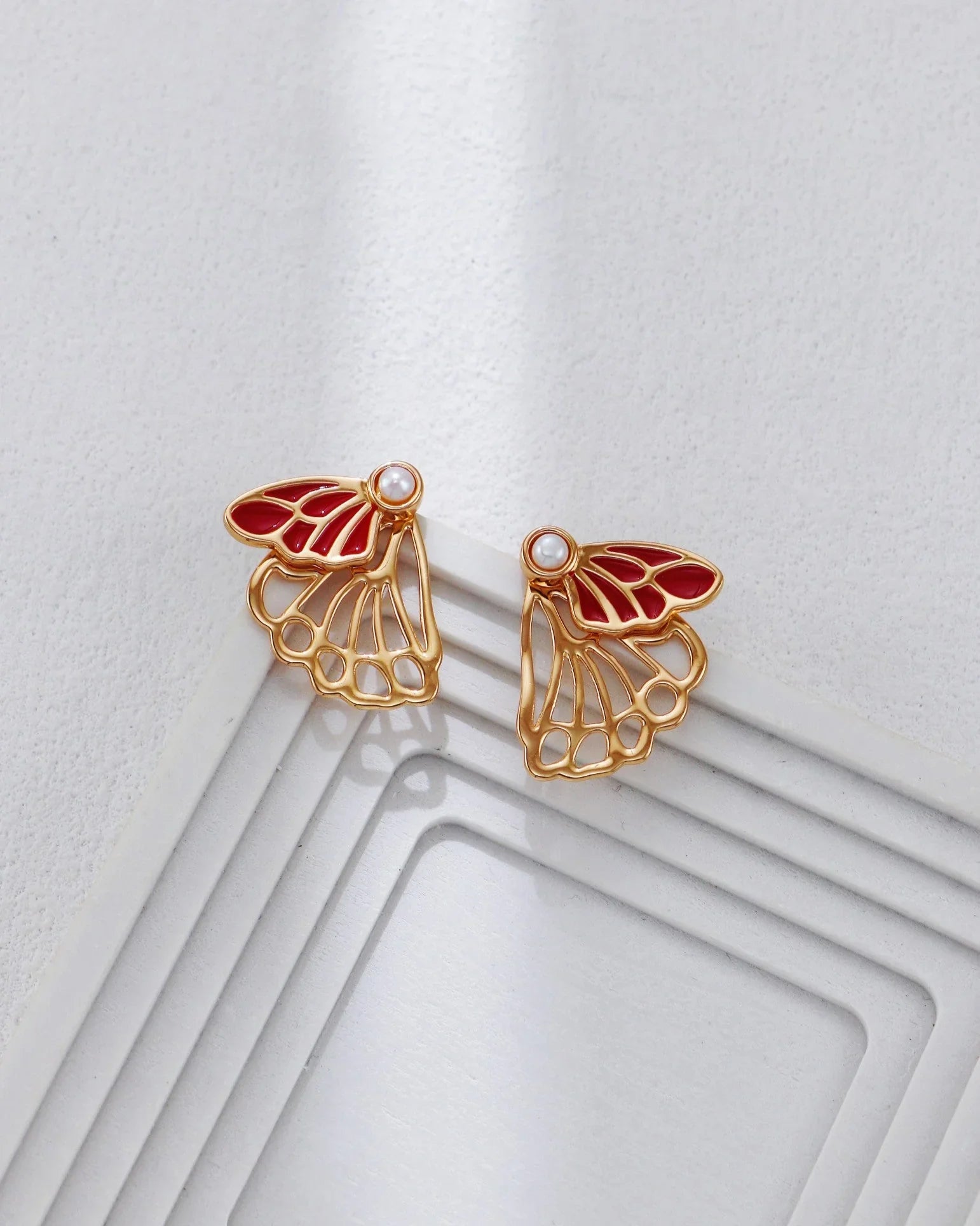 Crimson Butterfly-øredobbene utstråler lidenskap og vitalitet. Den livlige røde emaljen gløder som ild og symboliserer energi og selvtillit. Sommerfuglvingene skimrer med intrikate mønstre og fanger lyset med en fengslende glans. Disse øredobbene er laget med allsidighet for bruk sammen, og kombinerer vintage gulldetaljer med dristige røde nyanser, noe som gjør dem både elegante og dynamiske. Et perfekt statement-plagg som bringer liv, bevegelse og unik sjarm til ethvert antrekk.