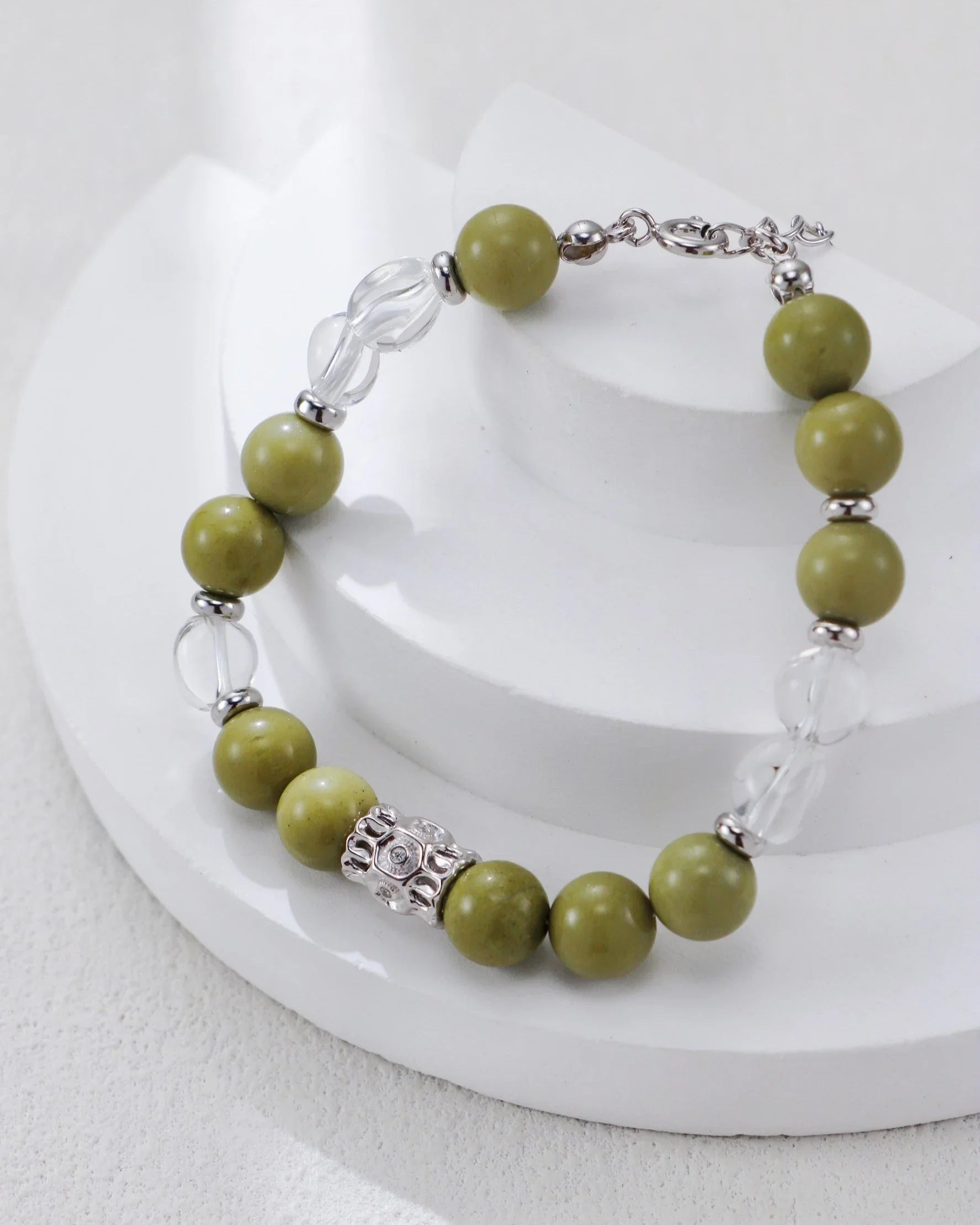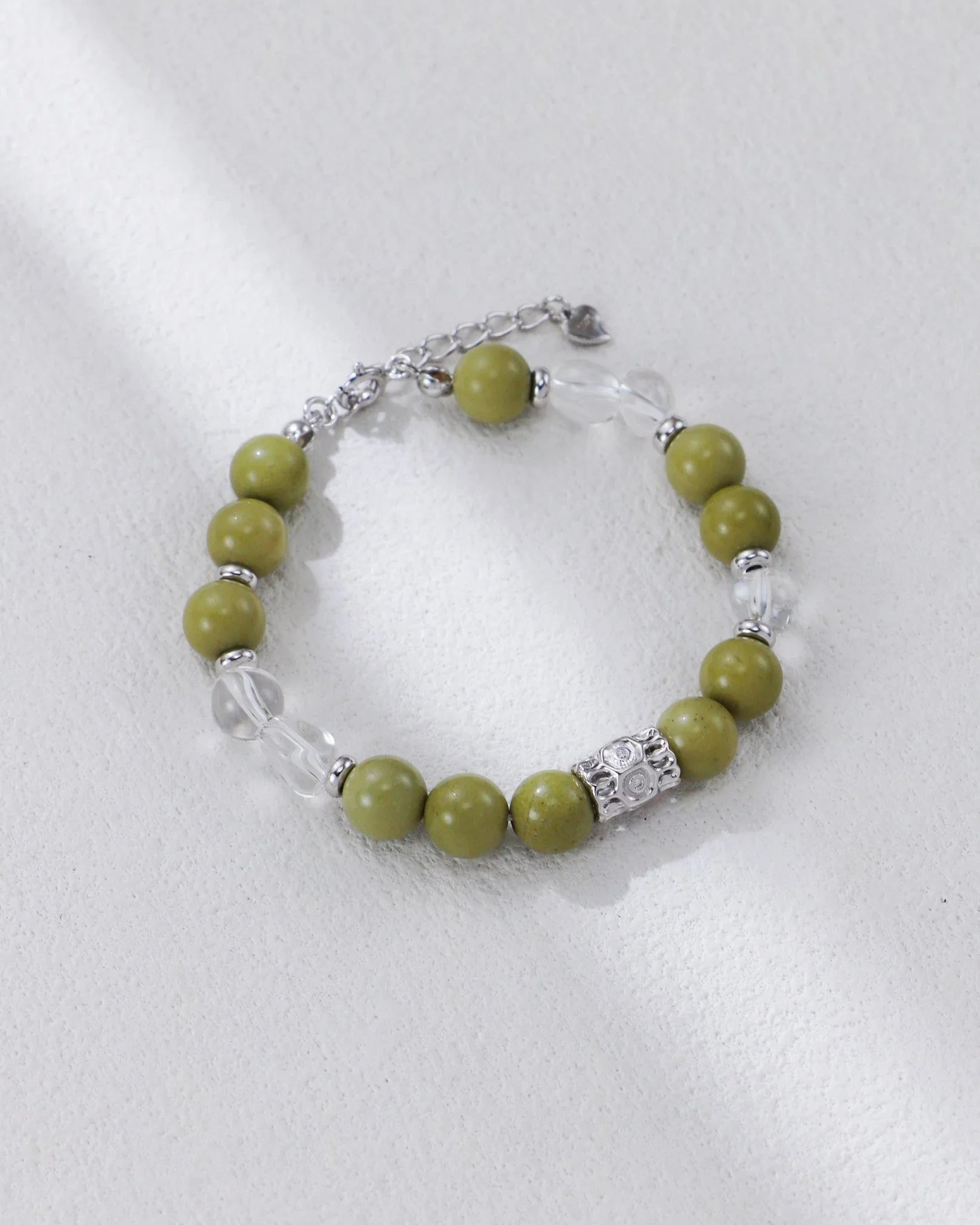 Desert Spirit Crystal Bracelet bringer ørkenens romantikk rett til håndleddet ditt. Alxa-steinen, kjent for sine rike grønne fargetoner, avslører naturlige teksturer formet av tid og jord. Sammen med klare krystaller skaper den en slående kontrast – frisk, beroligende og full av balanse. Laget av sterlingsølv blander dette armbåndet naturens kunstneriske ferdigheter med raffinert design, noe som gjør det både helbredende og stilig for daglig bruk.