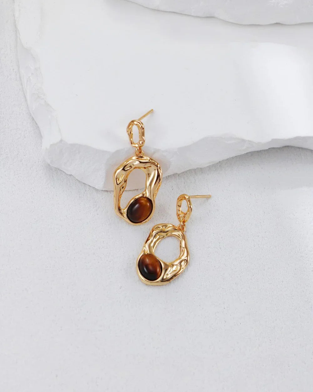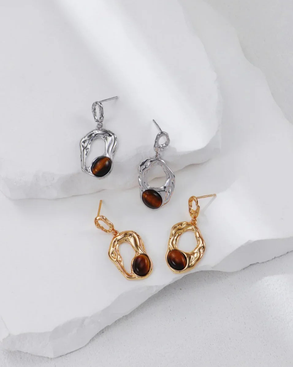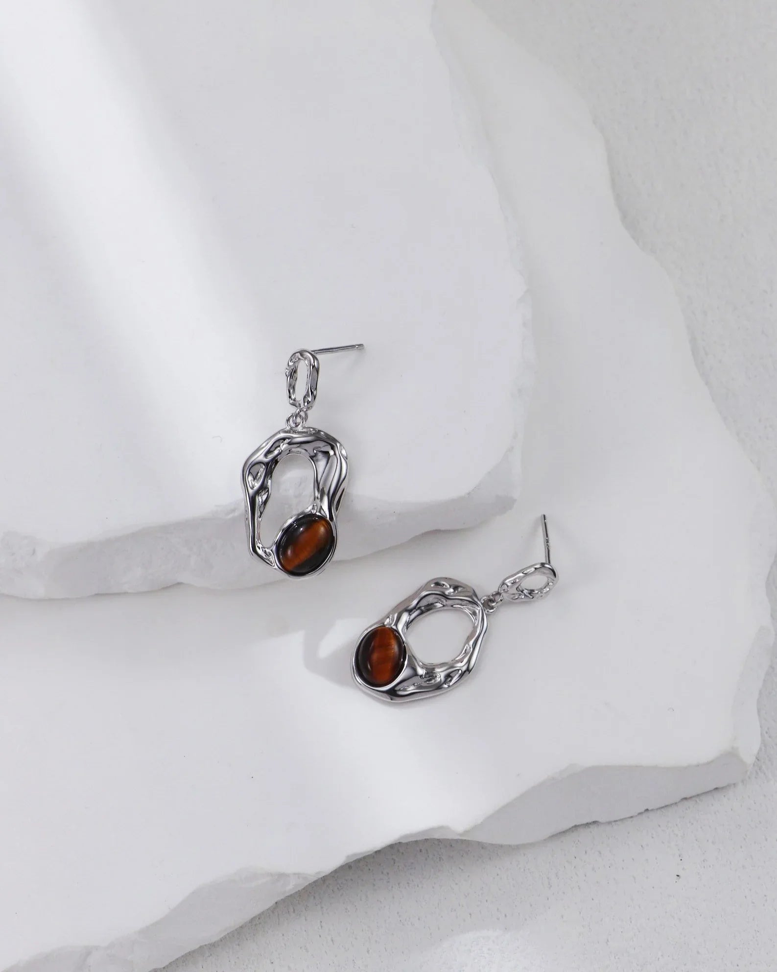 Sølvlinjer flyter som måneskinn og tegner en grasiøs og uanstrengt silhuett. I midten glimter tigerøye som en gammel, fallen stjerne og utstråler både mystikk og varme. Kontrasten mellom lysende sølv og dyp gyllen stein skaper et design som er tidløst, elegant og fullt av himmelsk sjarm.