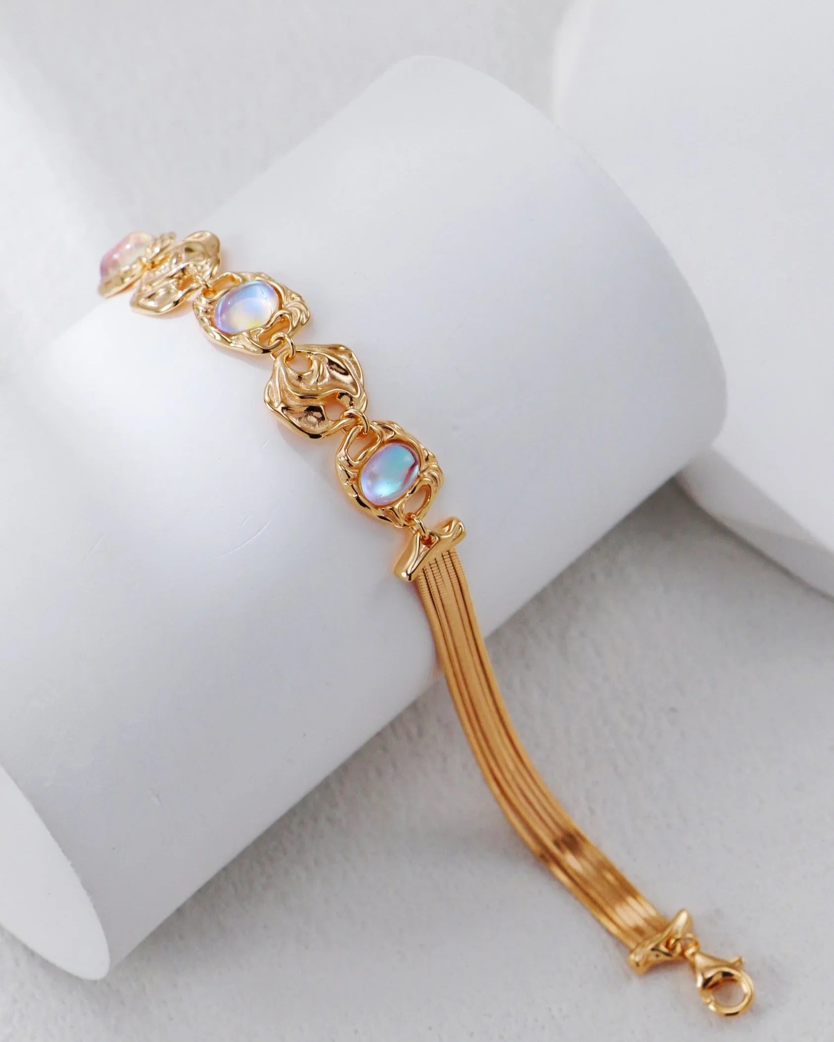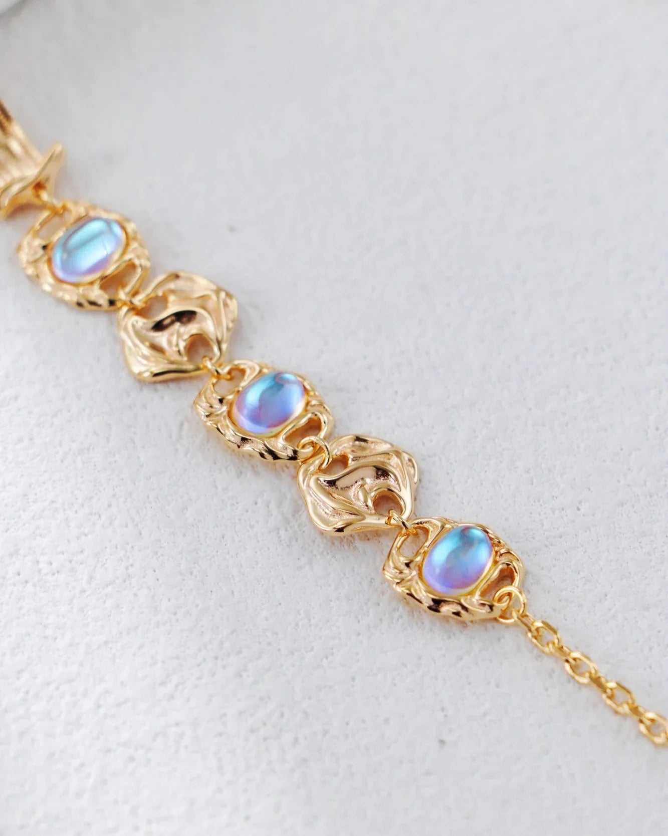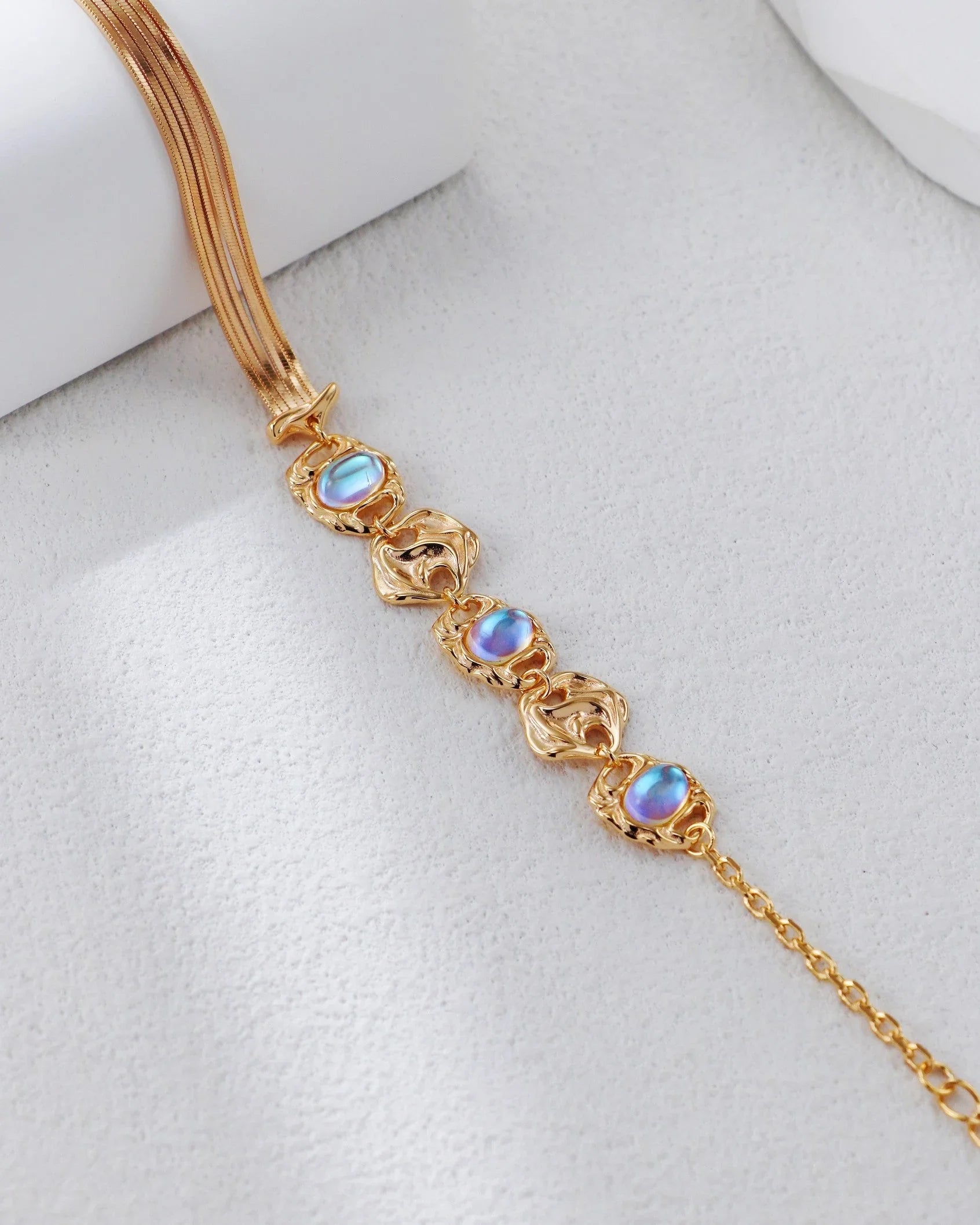 Moonlit Dreams-armbåndet har flere fine slangekjeder, der de glatte, flytende linjene skaper et raffinert og elegant utseende. I midten er en lysende månestein sikkert innfattet med eksperthåndverk, som fremhever edelstenens naturlige skjønnhet samtidig som den sikrer varig holdbarhet. Dette smykket kombinerer grasiøs bevegelse med tidløst design, noe som gjør det både til et stiluttrykk og en talisman av energi.