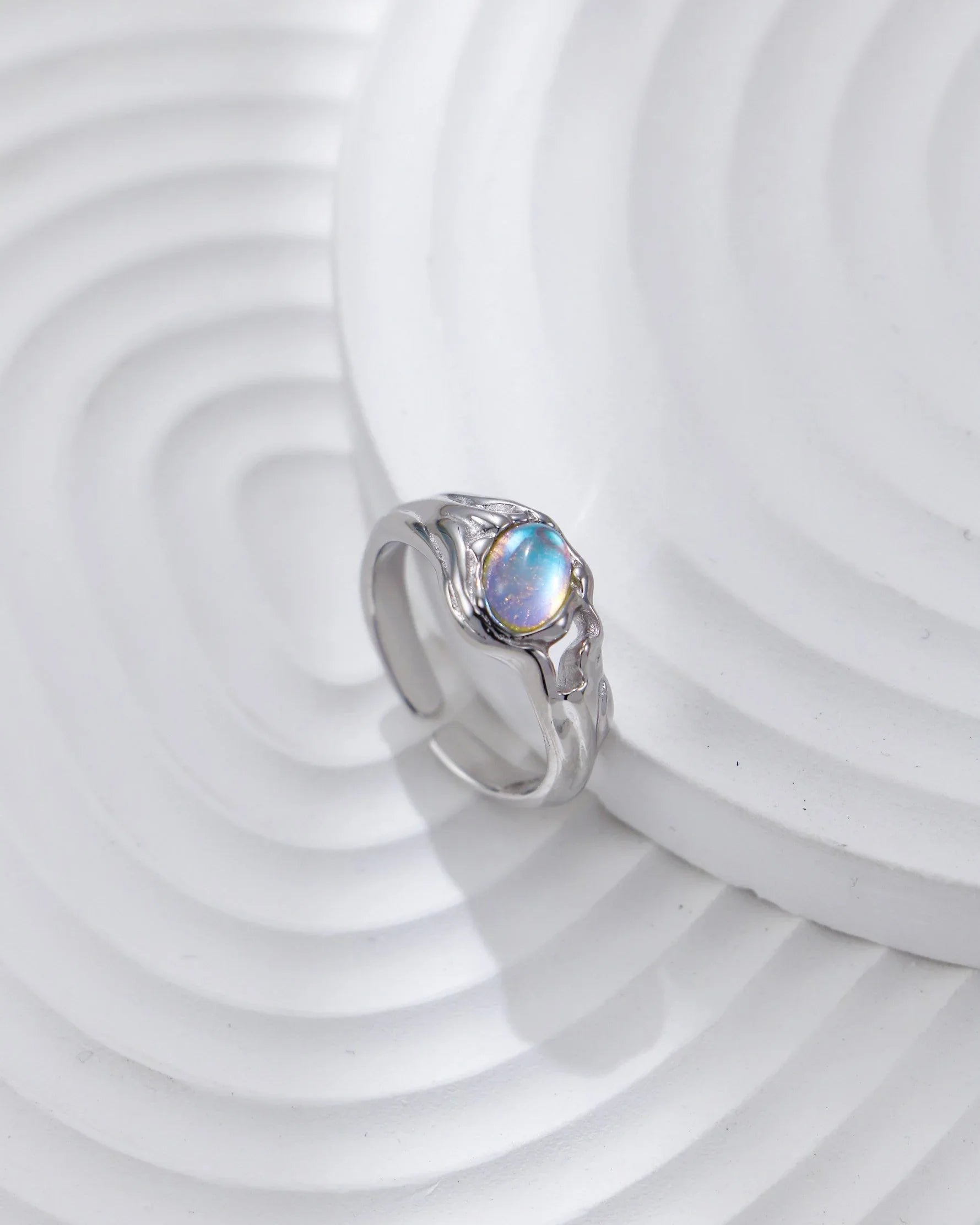 Moonlit Dreams-ringen fanger den milde gløden fra måneskinnet som faller ned fra nattehimmelen. Hver månestein er nøye polert og avslører dens karakteristiske adularescens – mykt, skiftende lys som strømmer stille inn i edelstenen. Denne eteriske og fengslende ringen bærer den rolige skjønnheten av måneskinnet, noe som gjør den til et tidløst symbol på eleganse og mystikk.
