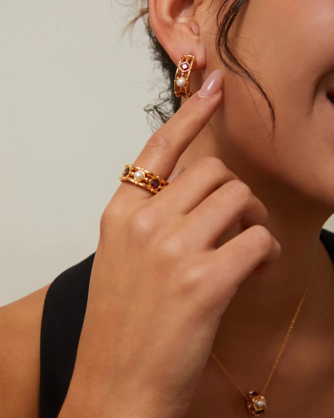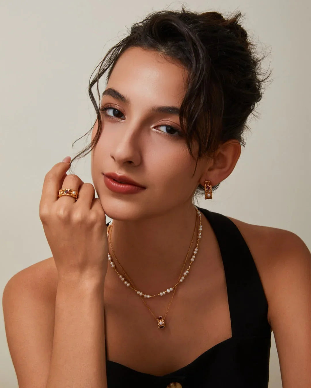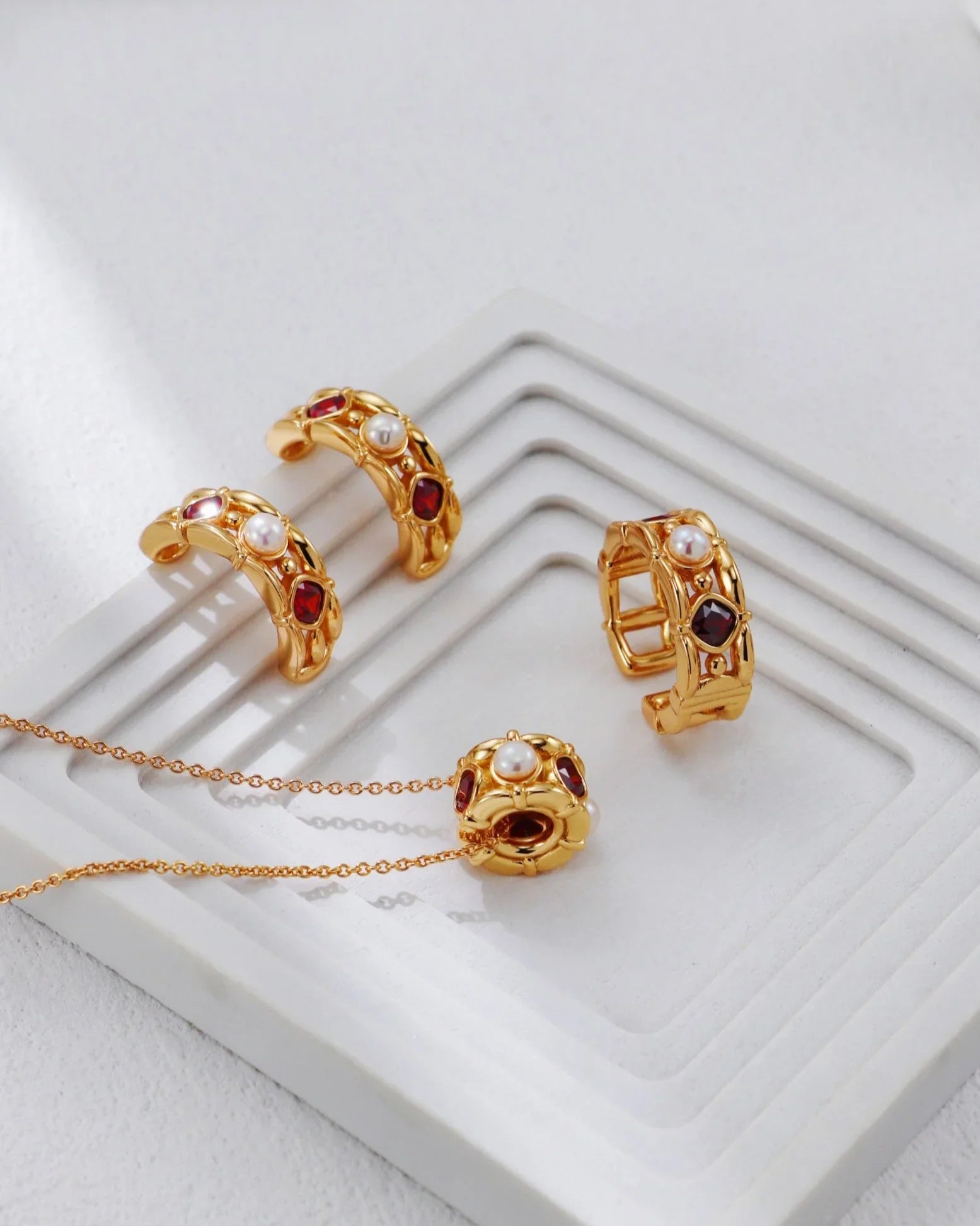 Sammen symboliserer perlene og den røde zirkonen harmoni – ro som møter lidenskap, eleganse som omfavner styrke. Et smykkesett som ikke bare er vakkert, men også et uttrykk for individualitet og raffinert smak.